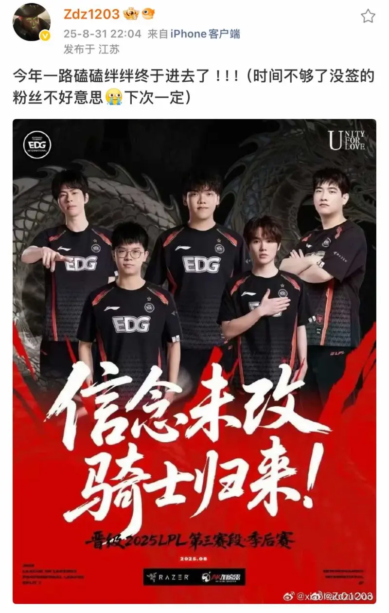 虎扑08月31日讯 成功击败WE挺进季后赛后Zdz发文: